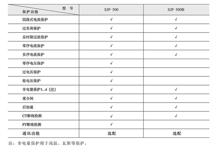 SJP-500系列保護適用于線路保護,電容出線保護,廠用變保護和線路保護。針對被保護設備及保護要求的不同,SJP-500系列保護的型號和功能配置如下: