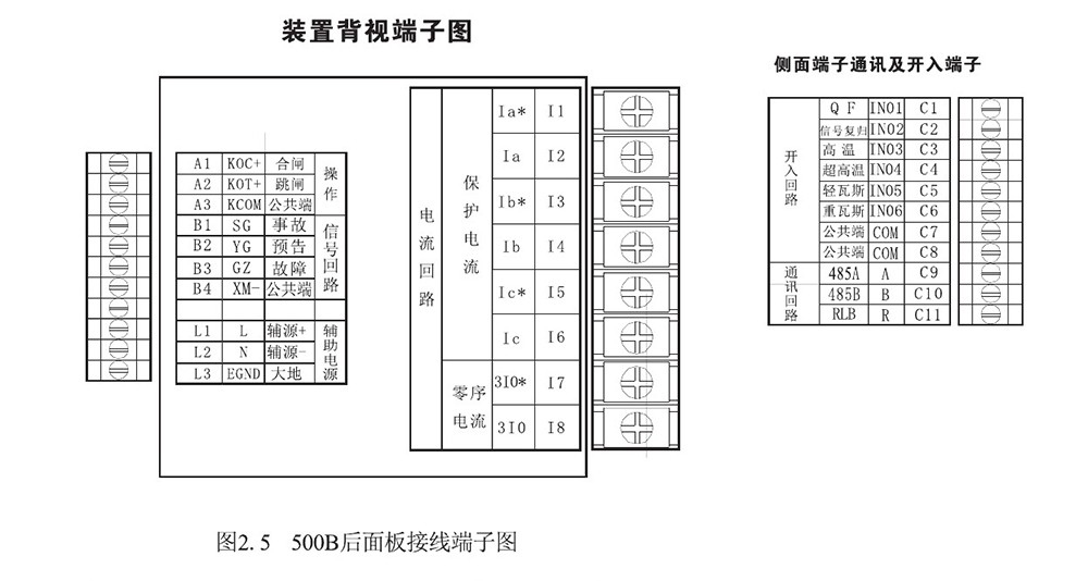 I1-I8端子為電流端子,其中11-I6端子為保護電流輸入端子,當保護采用兩相式保護時,I3、 14懸空。 I7、I8端子為零序電流輸入端子,帶*號為同名端,接線時請注意。